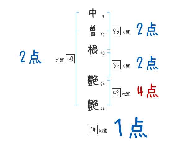 総運![]() | 中曽根艶艶さんの総運は74画の1つ星!無気力で怠惰な生活送りがち。規則正しい生活を送るよう気をつけましょう。 あなたの人生を表す1番重要な運勢です。生涯を通じて影響する総合運となり、主に50歳以降の晩年期に影響を及ぼします。 |