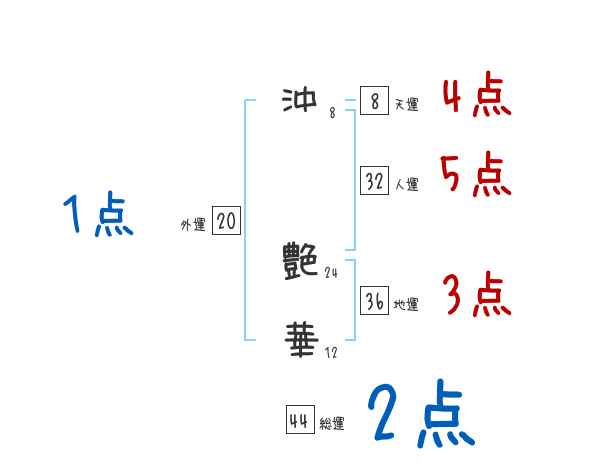 人運![]() | 沖艶華さんの人運は32画の5つ星!柔軟性があり成功する。チャンスが多く金運が良い。 性格や才能などを表す2番目に重要な運勢です。人間関係や協調性、社会的な成功に影響します。主に20歳から50歳ぐらいまでの中年期の運勢を表します。 |