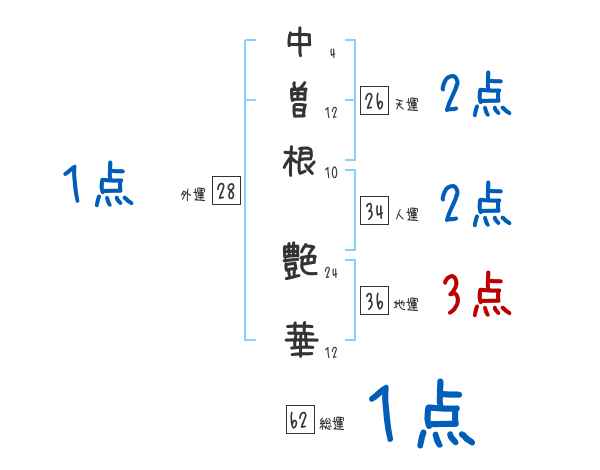 天運![]() | 中曽根艶華さんの天運は26画の2つ星!波瀾万丈かも。信頼できる人を大事にしましょう。 家系が持つ宿命的な運勢を表します。祖先から受け継いだ苗字ですので自分の力が及びません。家柄を象徴します。 |