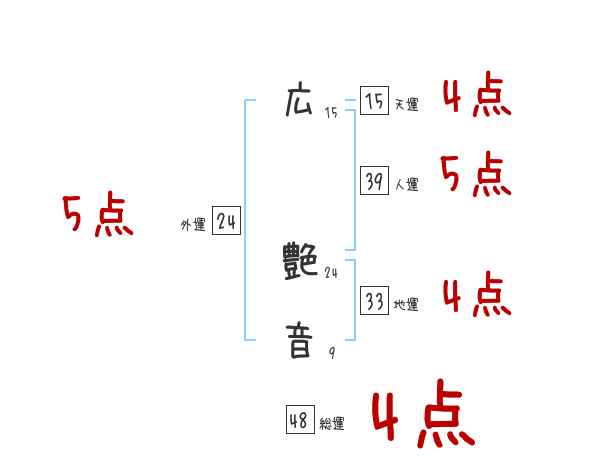 外運![]() | 広艶音さんの外運は24画の5つ星!家庭運が良く順調な人生。金運にも恵まれる。 生活面を象徴する運勢です。外部から受ける影響力を表し、結婚運、家庭運や職場、環境への順応性を表します。 |