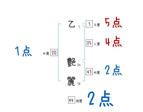 天運![]() | 乙艶麗さんの天運は1画の5つ星!行動力、指導力があり出世し繁栄する。幸運に恵まれる。 家系が持つ宿命的な運勢を表します。祖先から受け継いだ苗字ですので自分の力が及びません。家柄を象徴します。 |