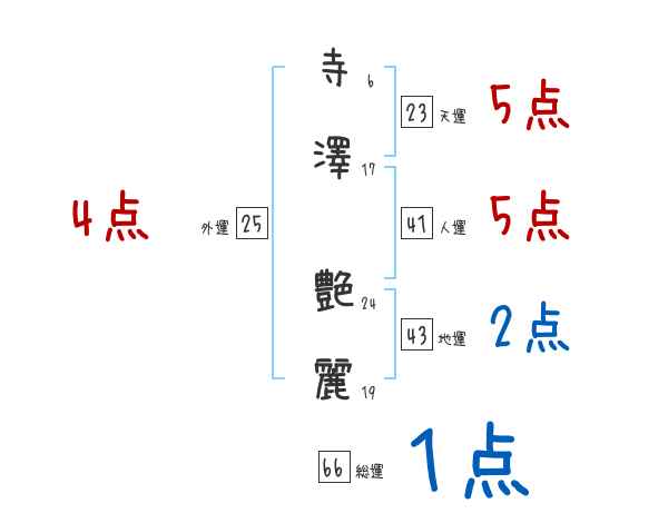 天運![]() | 寺澤艶麗さんの天運は23画の5つ星!想像力に優れ活力がある。一代で成功し名誉を手に入れる。 家系が持つ宿命的な運勢を表します。祖先から受け継いだ苗字ですので自分の力が及びません。家柄を象徴します。 |