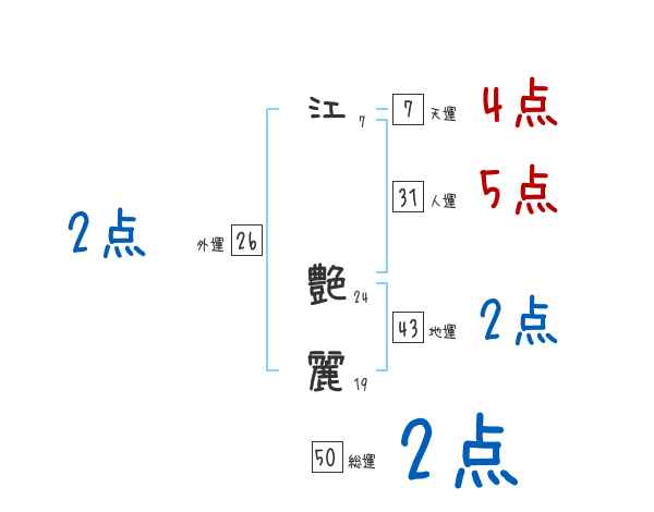 外運![]() | 江艶麗さんの外運は26画の2つ星!波瀾万丈かも。信頼できる人を大事にしましょう。 生活面を象徴する運勢です。外部から受ける影響力を表し、結婚運、家庭運や職場、環境への順応性を表します。 |
