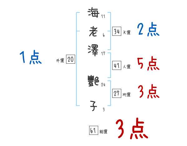 総運![]() | 海老澤艷子さんの総運は61画の3つ星!強情な性格でうぬぼれタイプ。自ら破滅する。 あなたの人生を表す1番重要な運勢です。生涯を通じて影響する総合運となり、主に50歳以降の晩年期に影響を及ぼします。 |