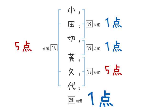 外運![]() | 小田切芙久代さんの外運は16画の5つ星!人望が厚く大きく発展する。逆転成功が見える。 生活面を象徴する運勢です。外部から受ける影響力を表し、結婚運、家庭運や職場、環境への順応性を表します。 |