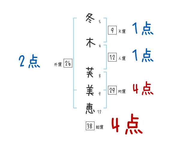 天運![]() | 冬木芙美恵さんの天運は9画の1つ星!消極的で才能を発揮することが苦手なことも。周りの意見に耳を傾けましょう。 家系が持つ宿命的な運勢を表します。祖先から受け継いだ苗字ですので自分の力が及びません。家柄を象徴します。 |