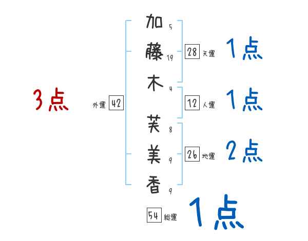 総運![]() | 加藤木芙美香さんの総運は54画の1つ星!トラブルが多いかも。周りをよく見て協調して過ごしましょう。 あなたの人生を表す1番重要な運勢です。生涯を通じて影響する総合運となり、主に50歳以降の晩年期に影響を及ぼします。 |