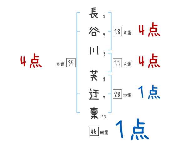 総運![]() | 長谷川芙迂稟さんの総運は46画の1つ星!迷走することが多く苦労するかも。目先のことにとらわれないように。 あなたの人生を表す1番重要な運勢です。生涯を通じて影響する総合運となり、主に50歳以降の晩年期に影響を及ぼします。 |
