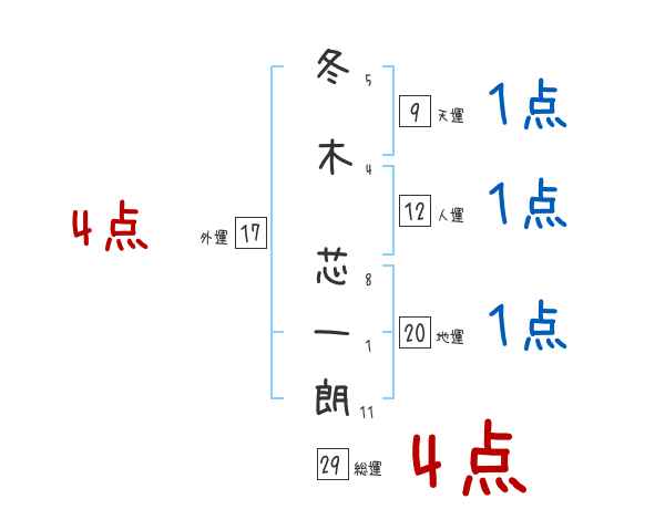 天運![]() | 冬木芯一朗さんの天運は9画の1つ星!消極的で才能を発揮することが苦手なことも。周りの意見に耳を傾けましょう。 家系が持つ宿命的な運勢を表します。祖先から受け継いだ苗字ですので自分の力が及びません。家柄を象徴します。 |