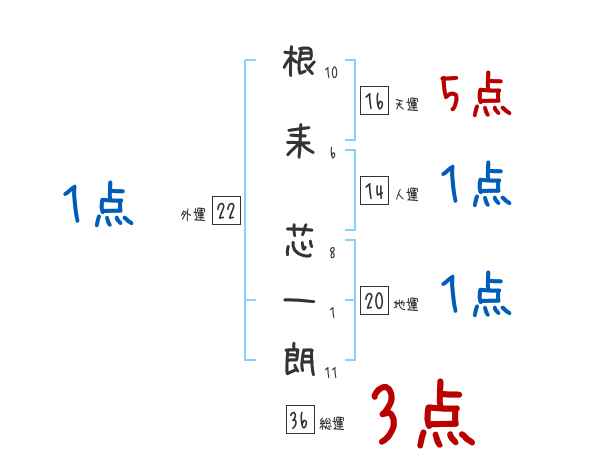 天運![]() | 根耒芯一朗さんの天運は16画の5つ星!人望が厚く大きく発展する。逆転成功が見える。 家系が持つ宿命的な運勢を表します。祖先から受け継いだ苗字ですので自分の力が及びません。家柄を象徴します。 |