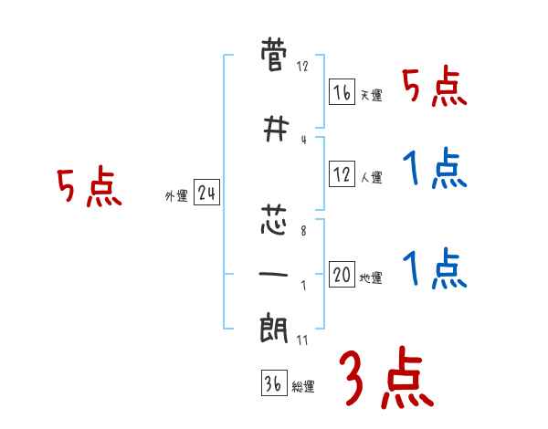 総運![]() | 菅井芯一朗さんの総運は36画の3つ星!先見性が豊かです。多少神経質で苦労することも。 あなたの人生を表す1番重要な運勢です。生涯を通じて影響する総合運となり、主に50歳以降の晩年期に影響を及ぼします。 |