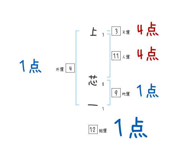 外運![]() | 上芯一さんの外運は4画の1つ星!感情が不安定で苦労するかも。周囲との協調を心掛けましょう。 生活面を象徴する運勢です。外部から受ける影響力を表し、結婚運、家庭運や職場、環境への順応性を表します。 |