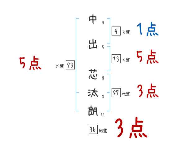 総運![]() | 中出芯汰朗さんの総運は36画の3つ星!先見性が豊かです。多少神経質で苦労することも。 あなたの人生を表す1番重要な運勢です。生涯を通じて影響する総合運となり、主に50歳以降の晩年期に影響を及ぼします。 |
