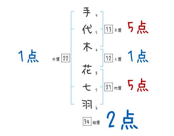 天運![]() | 手代木花七羽さんの天運は13画の5つ星!才能に恵まれ人気がある。名声を手に入れる。円満な人生。 家系が持つ宿命的な運勢を表します。祖先から受け継いだ苗字ですので自分の力が及びません。家柄を象徴します。 |