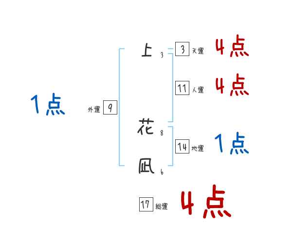 天運![]() | 上花凪さんの天運は3画の4つ星!活動的で才能に恵まれ、多くの信頼を得る。希望に満ち成長する。 家系が持つ宿命的な運勢を表します。祖先から受け継いだ苗字ですので自分の力が及びません。家柄を象徴します。 |