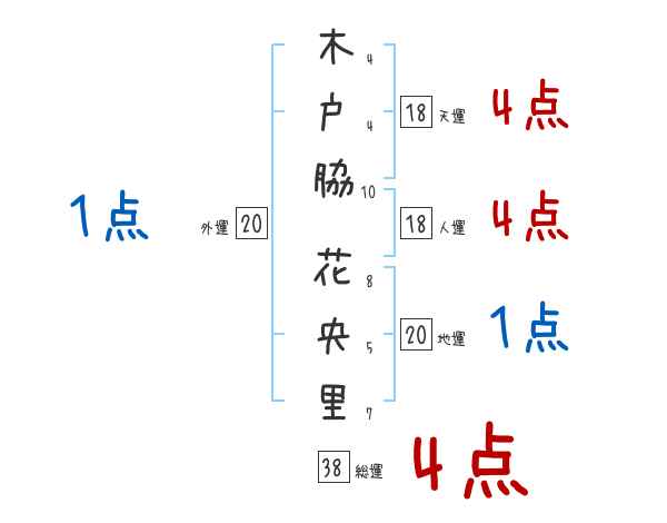 天運![]() | 木戸脇花央里さんの天運は18画の4つ星!情熱的で剛気。忍耐力があり信頼される。 家系が持つ宿命的な運勢を表します。祖先から受け継いだ苗字ですので自分の力が及びません。家柄を象徴します。 |
