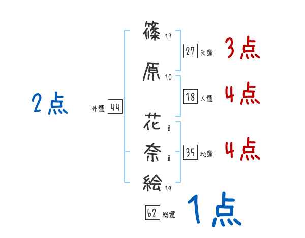 天運![]() | 篠原花奈絵さんの天運は27画の3つ星!頭脳明晰だが強情で摩擦が多い傾向。孤立に注意。 家系が持つ宿命的な運勢を表します。祖先から受け継いだ苗字ですので自分の力が及びません。家柄を象徴します。 |