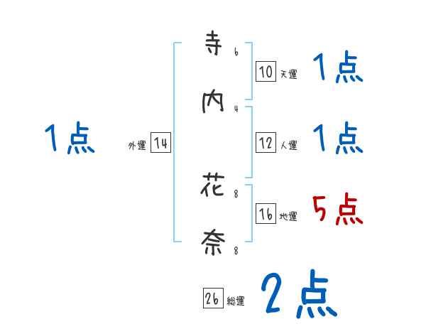 天運![]() | 寺内花奈さんの天運は10画の1つ星!不安を感じやすい傾向。ストレスを抱えないように注意しましょう。 家系が持つ宿命的な運勢を表します。祖先から受け継いだ苗字ですので自分の力が及びません。家柄を象徴します。 |