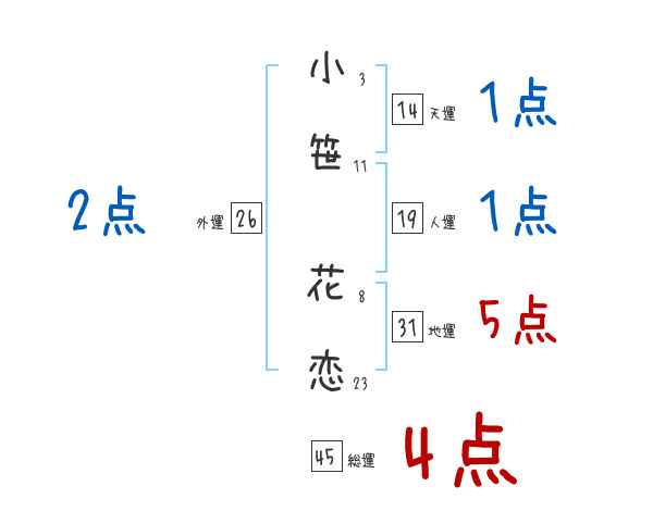 外運![]() | 小笹花恋さんの外運は26画の2つ星!波瀾万丈かも。信頼できる人を大事にしましょう。 生活面を象徴する運勢です。外部から受ける影響力を表し、結婚運、家庭運や職場、環境への順応性を表します。 |