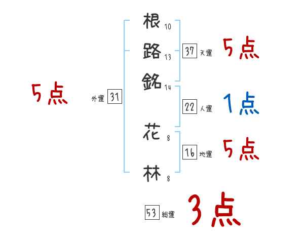 地運![]() | 根路銘花林さんの地運は16画の5つ星!人望が厚く大きく発展する。逆転成功が見える。 個性を表す基礎的な運勢です。性格形成や対人関係、行動力など家庭環境に影響されます。主に誕生してから20歳くらいまでの若年期の運勢を表します。 |