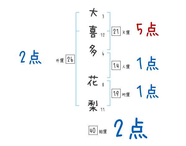 天運![]() | 大喜多花梨さんの天運は21画の5つ星!統率力がある。独立し成功する。名誉を手に入れる。 家系が持つ宿命的な運勢を表します。祖先から受け継いだ苗字ですので自分の力が及びません。家柄を象徴します。 |