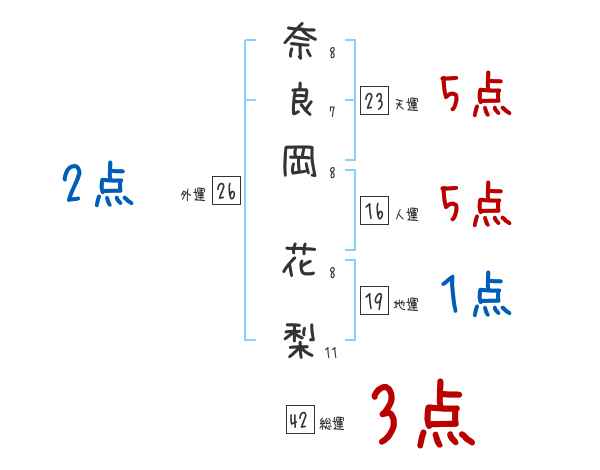 天運![]() | 奈良岡花梨さんの天運は23画の5つ星!想像力に優れ活力がある。一代で成功し名誉を手に入れる。 家系が持つ宿命的な運勢を表します。祖先から受け継いだ苗字ですので自分の力が及びません。家柄を象徴します。 |