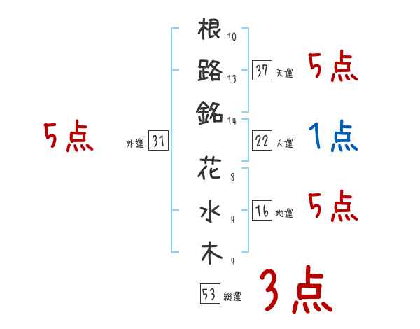 総運![]() | 根路銘花水木さんの総運は53画の3つ星!やや見栄っ張りで虚栄心がある。散財に注意。 あなたの人生を表す1番重要な運勢です。生涯を通じて影響する総合運となり、主に50歳以降の晩年期に影響を及ぼします。 |