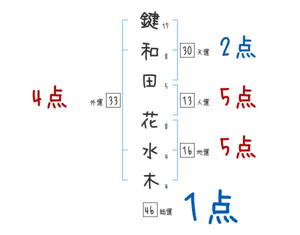 天運![]() | 鍵和田花水木さんの天運は30画の2つ星!浮き沈みの激しさに注意しましょう。 家系が持つ宿命的な運勢を表します。祖先から受け継いだ苗字ですので自分の力が及びません。家柄を象徴します。 |
