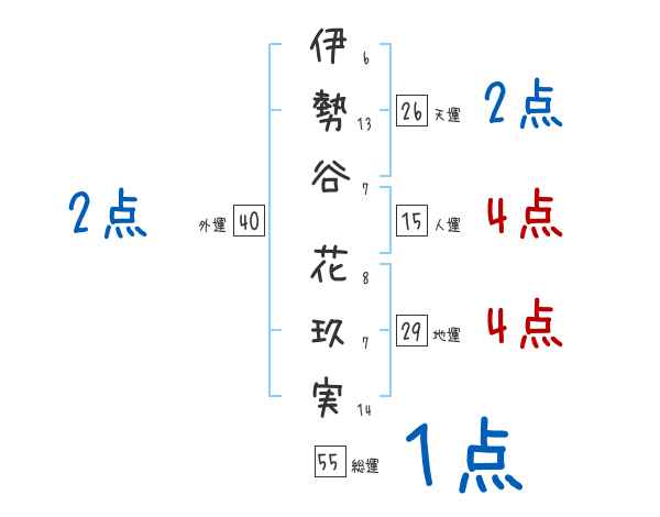天運![]() | 伊勢谷花玖実さんの天運は26画の2つ星!波瀾万丈かも。信頼できる人を大事にしましょう。 家系が持つ宿命的な運勢を表します。祖先から受け継いだ苗字ですので自分の力が及びません。家柄を象徴します。 |