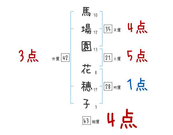 天運![]() | 馬場園花穂子さんの天運は35画の4つ星!温厚な性格で感受性が高い。穏和な性格で人望が厚い。 家系が持つ宿命的な運勢を表します。祖先から受け継いだ苗字ですので自分の力が及びません。家柄を象徴します。 |