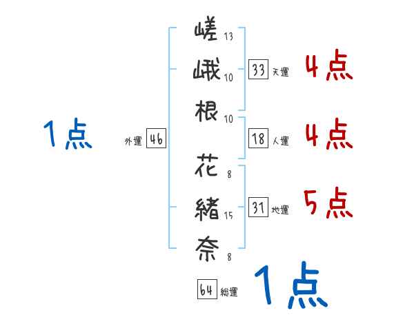 天運![]() | 嵯峨根花緒奈さんの天運は33画の4つ星!権力志向でプライドが高い。勇気があり運を切り開き成功する。 家系が持つ宿命的な運勢を表します。祖先から受け継いだ苗字ですので自分の力が及びません。家柄を象徴します。 |