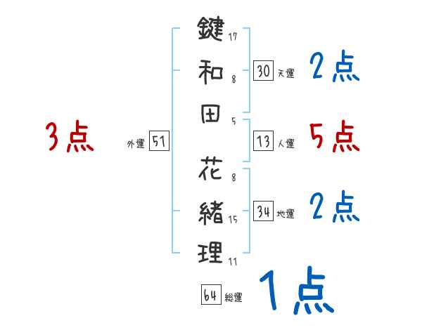 天運![]() | 鍵和田花緒理さんの天運は30画の2つ星!浮き沈みの激しさに注意しましょう。 家系が持つ宿命的な運勢を表します。祖先から受け継いだ苗字ですので自分の力が及びません。家柄を象徴します。 |