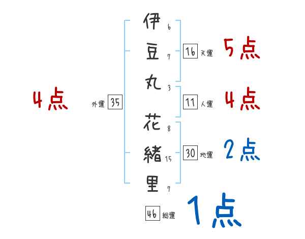 天運![]() | 伊豆丸花緒里さんの天運は16画の5つ星!人望が厚く大きく発展する。逆転成功が見える。 家系が持つ宿命的な運勢を表します。祖先から受け継いだ苗字ですので自分の力が及びません。家柄を象徴します。 |