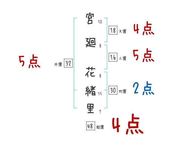 外運![]() | 宮廻花緒里さんの外運は32画の5つ星!柔軟性があり成功する。チャンスが多く金運が良い。 生活面を象徴する運勢です。外部から受ける影響力を表し、結婚運、家庭運や職場、環境への順応性を表します。 |
