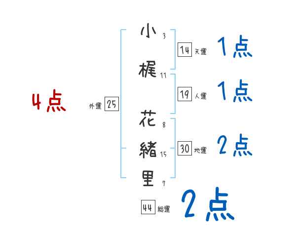 地運![]() | 小梶花緒里さんの地運は30画の2つ星!浮き沈みの激しさに注意しましょう。 個性を表す基礎的な運勢です。性格形成や対人関係、行動力など家庭環境に影響されます。主に誕生してから20歳くらいまでの若年期の運勢を表します。 |
