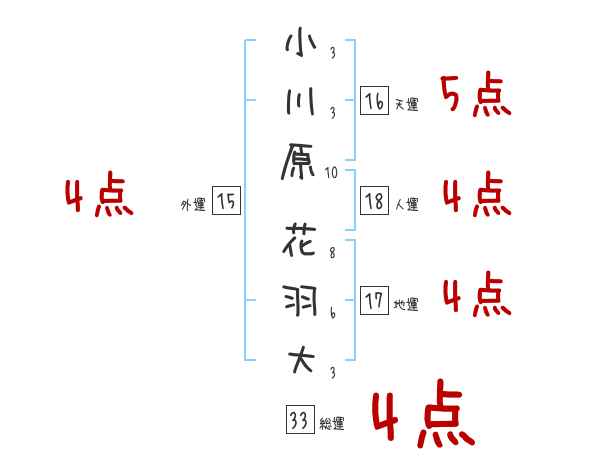 天運![]() | 小川原花羽大さんの天運は16画の5つ星!人望が厚く大きく発展する。逆転成功が見える。 家系が持つ宿命的な運勢を表します。祖先から受け継いだ苗字ですので自分の力が及びません。家柄を象徴します。 |