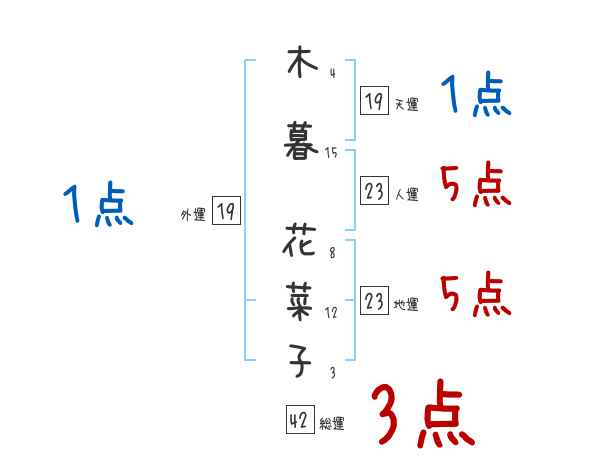 外運![]() | 木暮花菜子さんの外運は19画の1つ星!優れた才能を持ちますが、協調性が足りないことも。周りの人と協力する事を意識しましょう。 生活面を象徴する運勢です。外部から受ける影響力を表し、結婚運、家庭運や職場、環境への順応性を表します。 |