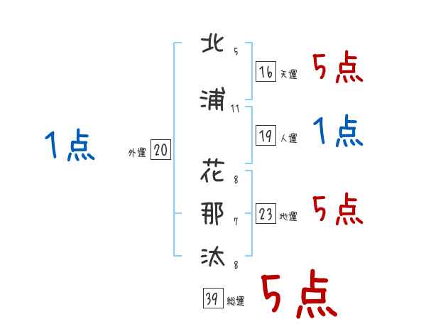 天運![]() | 北浦花那汰さんの天運は16画の5つ星!人望が厚く大きく発展する。逆転成功が見える。 家系が持つ宿命的な運勢を表します。祖先から受け継いだ苗字ですので自分の力が及びません。家柄を象徴します。 |