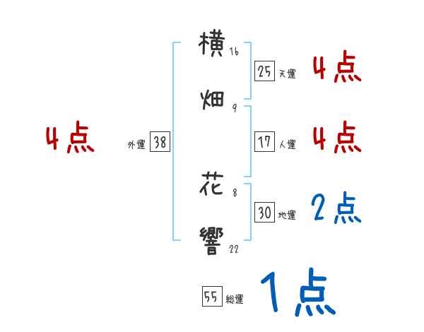 天運![]() | 横畑花響さんの天運は25画の4つ星!個性があり才能があふれる。強運の持ち主で発展する。 家系が持つ宿命的な運勢を表します。祖先から受け継いだ苗字ですので自分の力が及びません。家柄を象徴します。 |