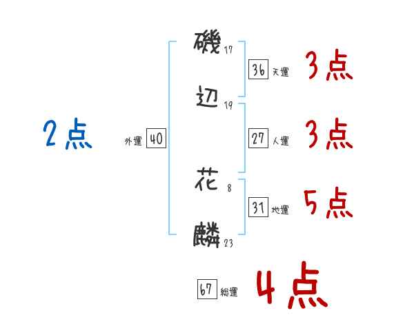人運![]() | 磯辺花麟さんの人運は27画の3つ星!頭脳明晰だが強情で摩擦が多い傾向。孤立に注意。 性格や才能などを表す2番目に重要な運勢です。人間関係や協調性、社会的な成功に影響します。主に20歳から50歳ぐらいまでの中年期の運勢を表します。 |