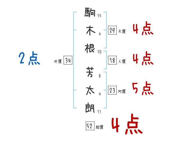 総運![]() | 駒木根芳太朗さんの総運は52画の4つ星!先見性と独創性に優れ考える力がある。強運の持ち主。 あなたの人生を表す1番重要な運勢です。生涯を通じて影響する総合運となり、主に50歳以降の晩年期に影響を及ぼします。 |