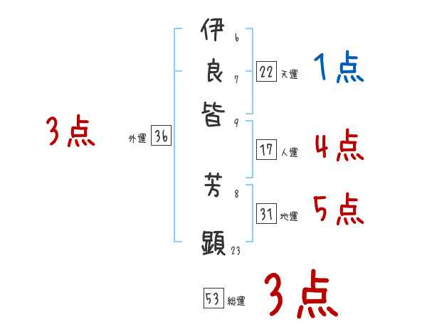 総運![]() | 伊良皆芳顕さんの総運は53画の3つ星!やや見栄っ張りで虚栄心がある。散財に注意。 あなたの人生を表す1番重要な運勢です。生涯を通じて影響する総合運となり、主に50歳以降の晩年期に影響を及ぼします。 |