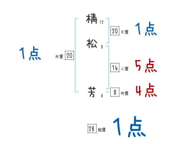 総運![]() | 棈松芳さんの総運は28画の1つ星!家庭環境に注意。スポーツで活躍できる能力があるかも。 あなたの人生を表す1番重要な運勢です。生涯を通じて影響する総合運となり、主に50歳以降の晩年期に影響を及ぼします。 |