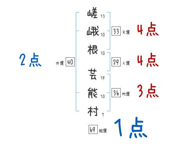 天運![]() | 嵯峨根芸能村さんの天運は33画の4つ星!権力志向でプライドが高い。勇気があり運を切り開き成功する。 家系が持つ宿命的な運勢を表します。祖先から受け継いだ苗字ですので自分の力が及びません。家柄を象徴します。 |