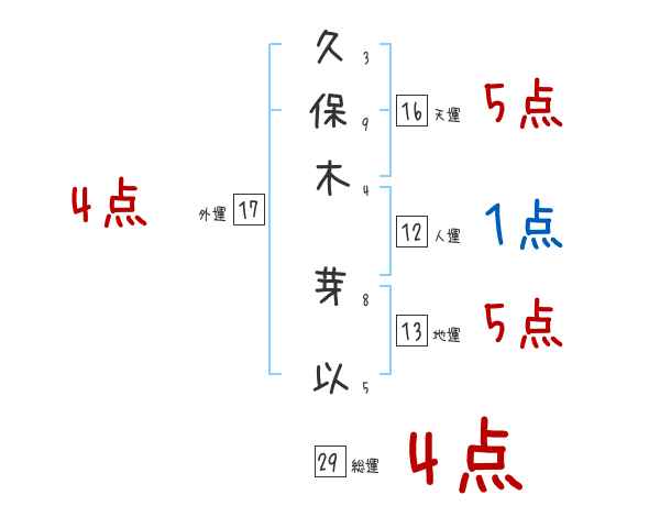 外運![]() | 久保木芽以さんの外運は17画の4つ星!積極的な行動力。地位を気づき財産を手に入れる。純粋な心と直感力。 生活面を象徴する運勢です。外部から受ける影響力を表し、結婚運、家庭運や職場、環境への順応性を表します。 |