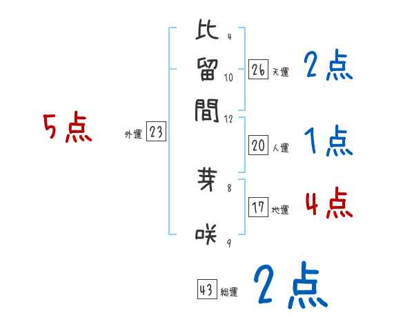 天運![]() | 比留間芽咲さんの天運は26画の2つ星!波瀾万丈かも。信頼できる人を大事にしましょう。 家系が持つ宿命的な運勢を表します。祖先から受け継いだ苗字ですので自分の力が及びません。家柄を象徴します。 |
