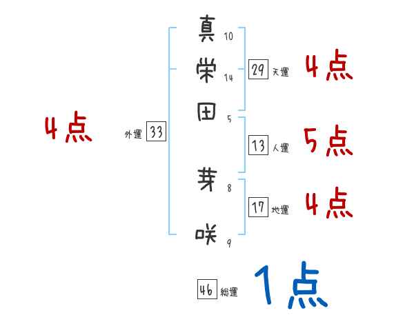総運![]() | 真栄田芽咲さんの総運は46画の1つ星!迷走することが多く苦労するかも。目先のことにとらわれないように。 あなたの人生を表す1番重要な運勢です。生涯を通じて影響する総合運となり、主に50歳以降の晩年期に影響を及ぼします。 |