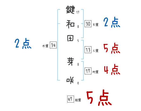 総運![]() | 鍵和田芽咲さんの総運は47画の5つ星!実力が開花し発展する円満な人生。財に恵まれる。 あなたの人生を表す1番重要な運勢です。生涯を通じて影響する総合運となり、主に50歳以降の晩年期に影響を及ぼします。 |