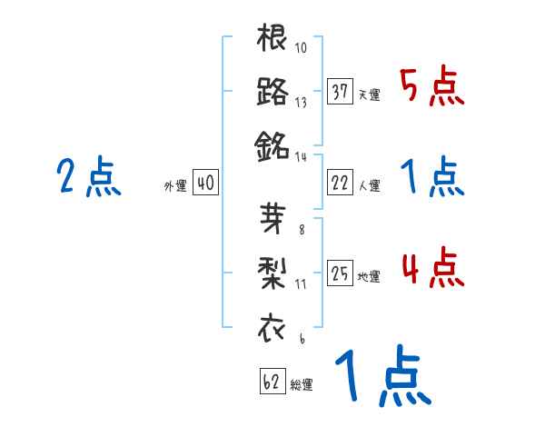 総運![]() | 根路銘芽梨衣さんの総運は62画の1つ星!困難なトラブルが多く精神的に疲労しないように気をつけましょう。 あなたの人生を表す1番重要な運勢です。生涯を通じて影響する総合運となり、主に50歳以降の晩年期に影響を及ぼします。 |
