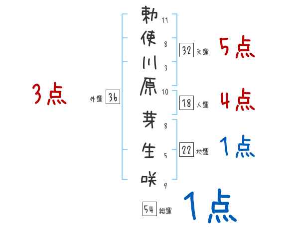 総運![]() | 勅使川原芽生咲さんの総運は54画の1つ星!トラブルが多いかも。周りをよく見て協調して過ごしましょう。 あなたの人生を表す1番重要な運勢です。生涯を通じて影響する総合運となり、主に50歳以降の晩年期に影響を及ぼします。 |
